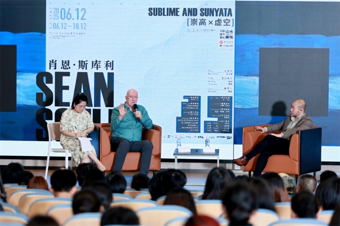 12日上午斯库利在学术讲座中分享了自己的创作哲学:“艺术世界像一台吃人的机器,但真正的艺术家必须抵抗固化,坚持内心的声音。”他以自己为例——从早期极简主义的《四倍网格》,到后期融入浪漫主义的《红色调调》,他不断“摧毁”既定风格,如同“灵魂的瓦工”重建语言的基石。