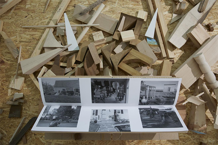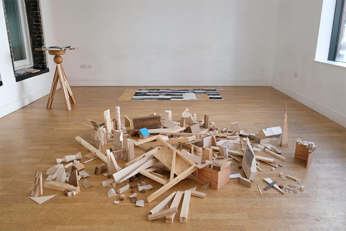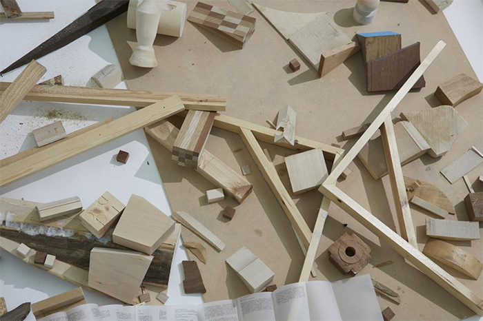 在作品《舀一碗水去拜访山泉》中,雷艺晴将各种形态不一的,棱角分明的,雕刻过的,残缺的、模糊的木头碎块,用一种看似有意又好像无意的方式散布于展览空间。